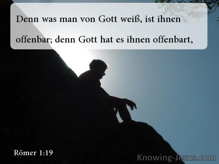 damit daß Gottes unsichtbares Wesen, das ist seine ewige Kraft und Gottheit, wird ersehen, so man des wahrnimmt, an den Werken, nämlich an der Schöpfung der Welt; also daß sie keine Entschuldigung haben, dieweil sie wußten, daß ein Gott ist, und haben ihn nicht gepriesen als einen Gott noch ihm gedankt, sondern sind in ihrem Dichten eitel geworden, und ihr unverständiges Herz ist verfinstert. Da sie sich für Weise hielten, sind sie zu Narren gewordenmehr lesen
