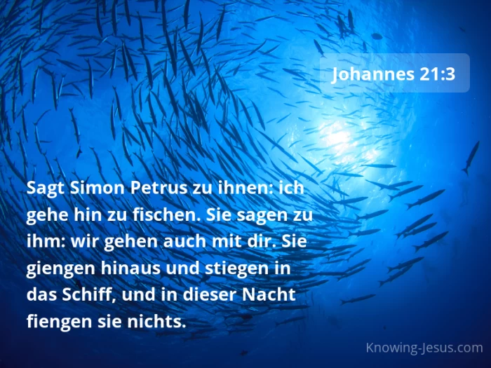 Sagt Simon Petrus zu ihnen: ich gehe hin zu fischen. Sie sagen zu ihm: wir gehen auch mit dir. Sie giengen hinaus und stiegen in das Schiff, und in dieser Nacht fiengen sie nichts.