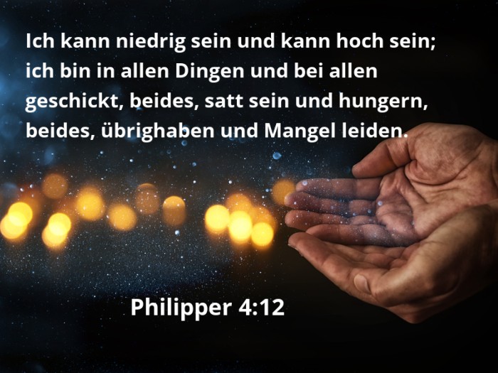 Ich kann niedrig sein und kann hoch sein; ich bin in allen Dingen und bei allen geschickt, beides, satt sein und hungern, beides, übrighaben und Mangel leiden.