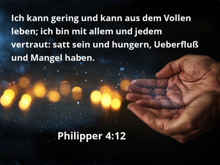 Ich kann gering und kann aus dem Vollen leben; ich bin mit allem und jedem vertraut: satt sein und hungern, Ueberfluß und Mangel haben.