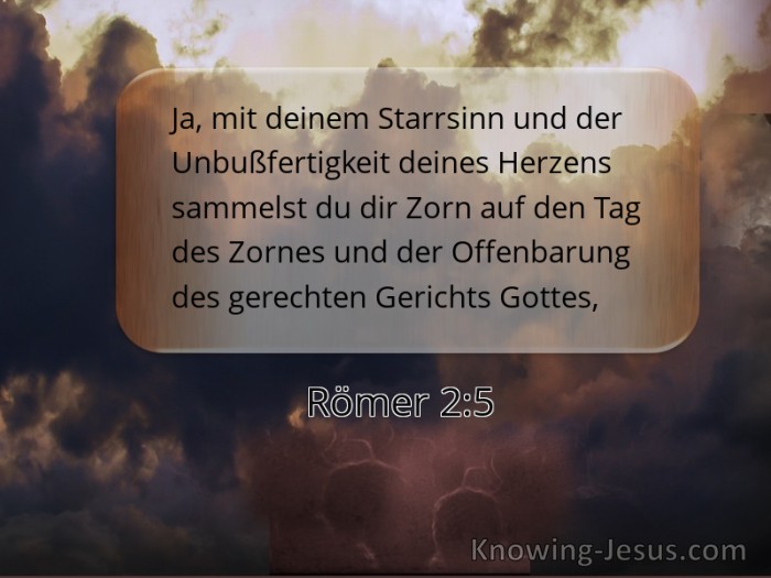 Ja, mit deinem Starrsinn und der Unbußfertigkeit deines Herzens sammelst du dir Zorn auf den Tag des Zornes und der Offenbarung des gerechten Gerichts Gottes,