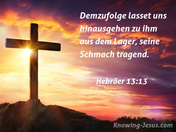 darum hat auch Jesus, auf daß er das Volk heilige durch sein eigenes Blut, außerhalb des Thores gelitten. Demzufolge lasset uns hinausgehen zu ihm aus dem Lager, seine Schmach tragend.