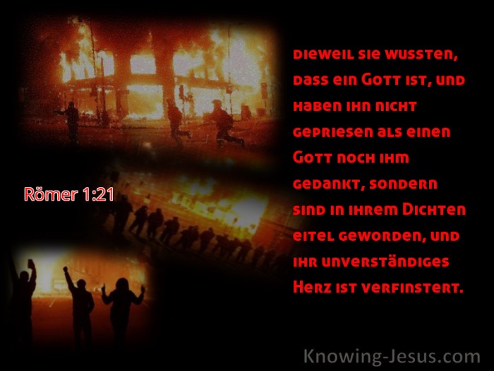 dieweil sie wußten, daß ein Gott ist, und haben ihn nicht gepriesen als einen Gott noch ihm gedankt, sondern sind in ihrem Dichten eitel geworden, und ihr unverständiges Herz ist verfinstert.