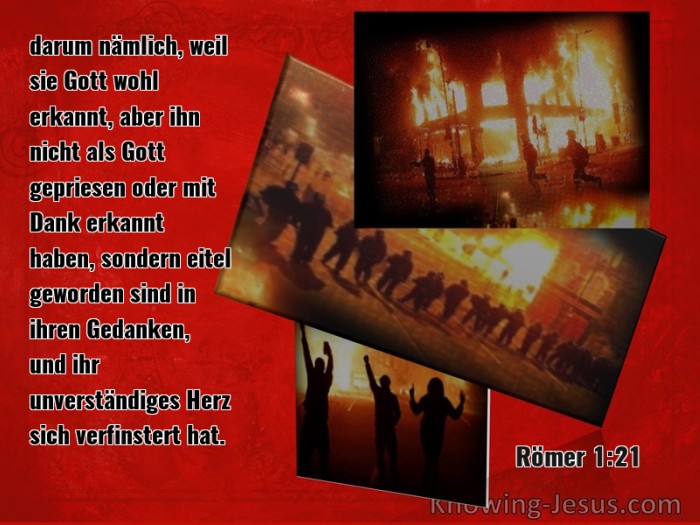 darum nämlich, weil sie Gott wohl erkannt, aber ihn nicht als Gott gepriesen oder mit Dank erkannt haben, sondern eitel geworden sind in ihren Gedanken, und ihr unverständiges Herz sich verfinstert hat.