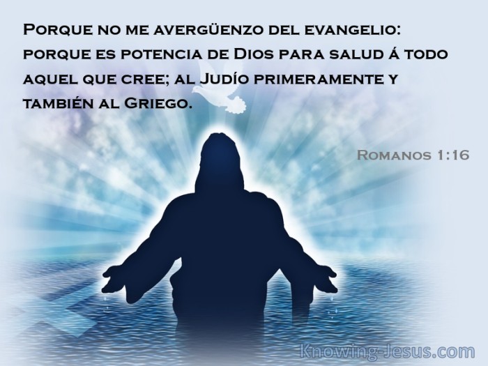 Porque no me avergüenzo del evangelio: porque es potencia de Dios para salud á todo aquel que cree; al Judío primeramente y también al Griego.