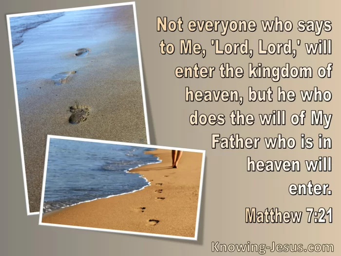 No todo el que me dice: Señor, Señor, entrará en el reino de los cielos, sino el que hace la voluntad de mi Padre que está en el cielo. Muchos me dirán en aquel día: Señor, Señor, ¿no profetizamos en tu nombre, y en tu nombre echamos fuera demonios, y en tu nombre hicimos muchos milagros? Y entonces les protestaré: Nunca os conocí; apartaos de mí, obradores de maldad.