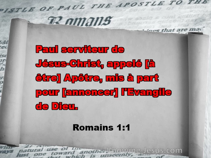 Paul serviteur de Jésus-Christ, appelé [à être] Apôtre, mis à part pour [annoncer] l'Evangile de Dieu.