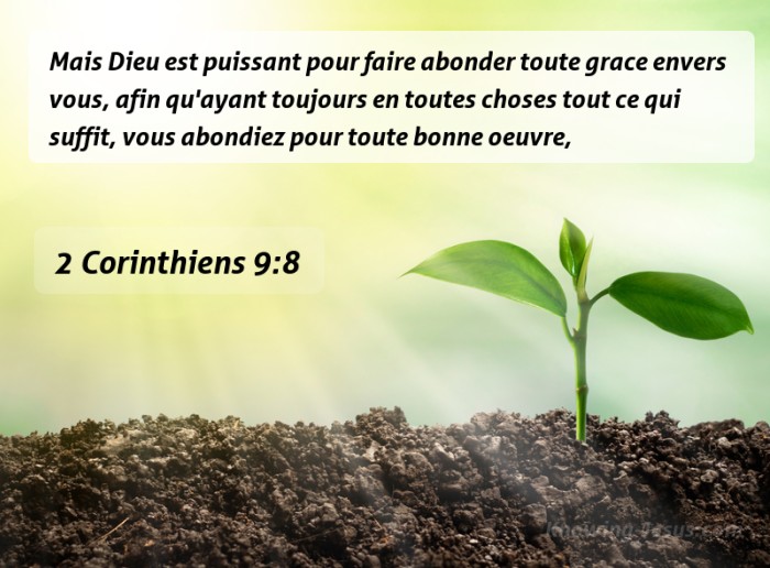 2 Corinthiens 9:8Mais Dieu est puissant pour faire abonder toute grace envers vous, afin qu'ayant toujours en toutes choses tout ce qui suffit, vous abondiez pour toute bonne oeuvre,