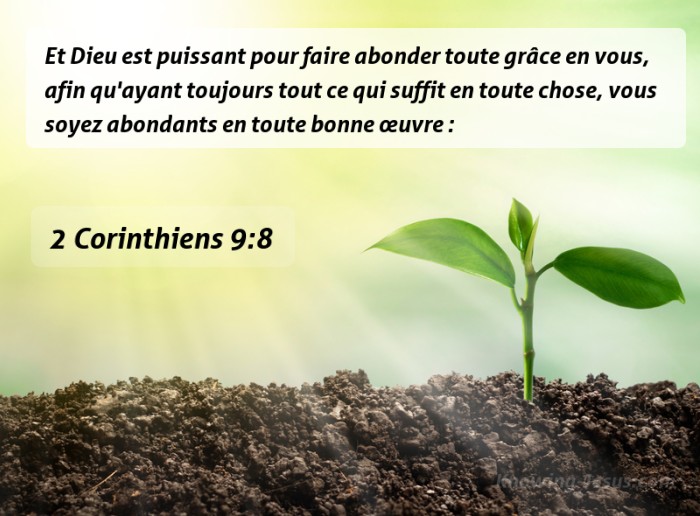 2 Corinthiens 9:8Et Dieu est puissant pour faire abonder toute grâce en vous, afin qu'ayant toujours tout ce qui suffit en toute chose, vous soyez abondants en toute bonne œuvre :