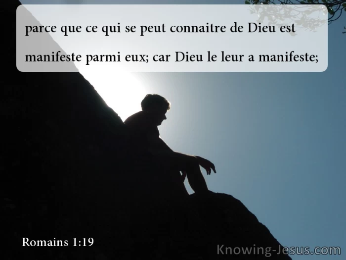 parce que ce qui se peut connaitre de Dieu est manifeste parmi eux; car Dieu le leur a manifeste; car, depuis la fondation du monde, ce qui ne se peut voir de lui, savoir et sa puissance eternelle et sa divinite, se discerne par le moyen de l'intelligence, par les choses qui sont faites, de maniere à les rendre inexcusables:
