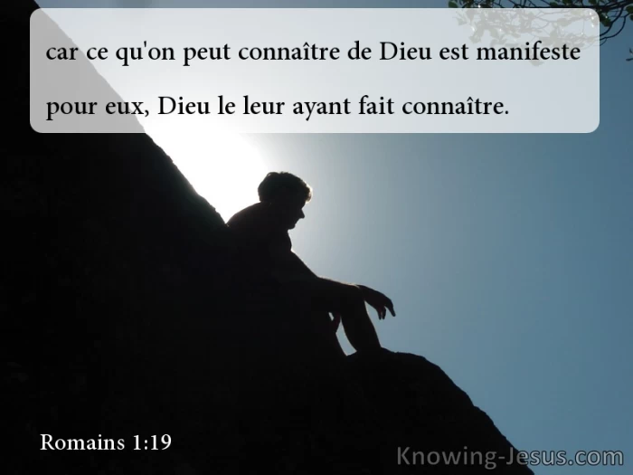 car ce qu'on peut connaître de Dieu est manifeste pour eux, Dieu le leur ayant fait connaître. En effet, les perfections invisibles de Dieu, sa puissance éternelle et sa divinité, se voient comme à l'oeil, depuis la création du monde, quand on les considère dans ses ouvrages. Ils sont donc inexcusables,
