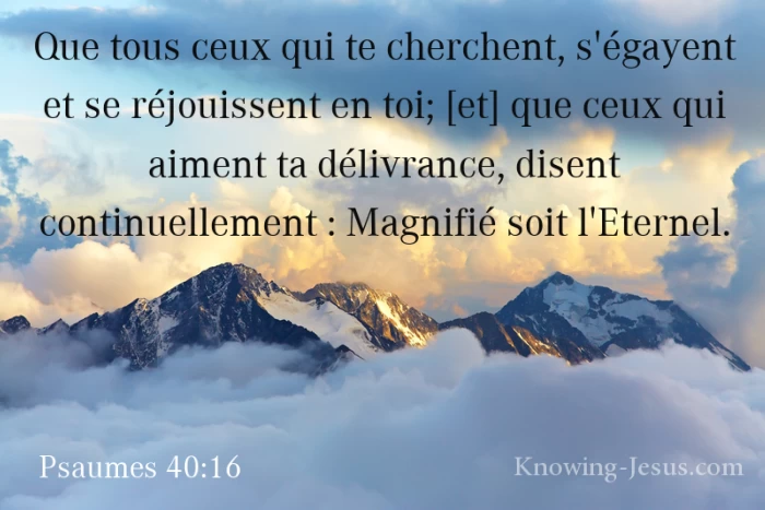 Que tous ceux qui te cherchent, s'égayent et se réjouissent en toi; [et] que ceux qui aiment ta délivrance, disent continuellement : Magnifié soit l'Eternel.