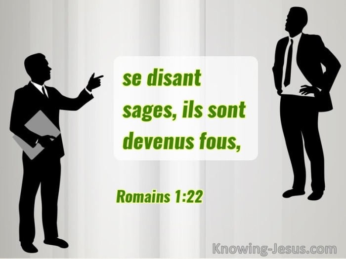 se disant sages, ils sont devenus fous, et ils ont change la gloire du Dieu incorruptible en la ressemblance de l'image d'un homme corruptible et d'oiseaux et de quadrupedes et de reptiles.