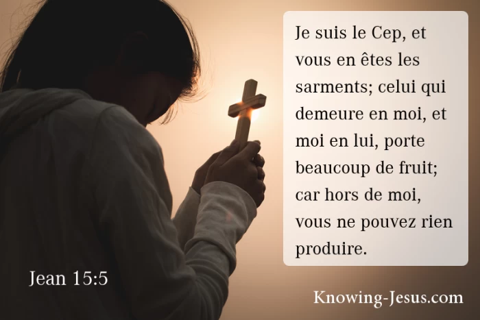 Demeurez en moi, et moi en vous; comme le sarment ne peut point de lui-même porter de fruit, s'il ne demeure au cep; vous [ne le pouvez point] aussi, si vous ne demeurez en moi. Je suis le Cep, et vous en êtes les sarments; celui qui demeure en moi, et moi en lui, porte beaucoup de fruit; car hors de moi, vous ne pouvez rien produire.