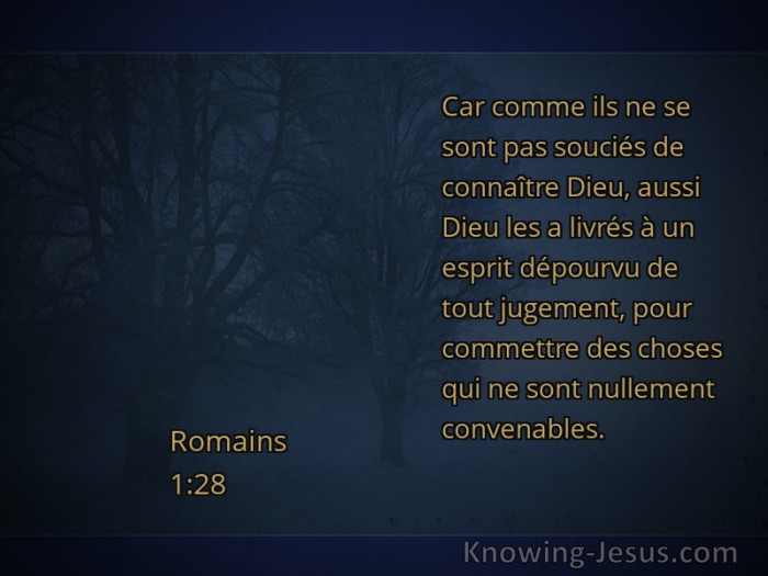 Car comme ils ne se sont pas souciés de connaître Dieu, aussi Dieu les a livrés à un esprit dépourvu de tout jugement, pour commettre des choses qui ne sont nullement convenables.