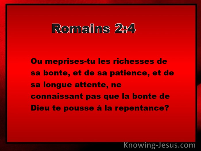 Ou meprises-tu les richesses de sa bonte, et de sa patience, et de sa longue attente, ne connaissant pas que la bonte de Dieu te pousse à la repentance?