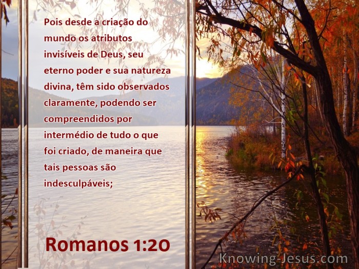 pois o que de Deus se pode conhecer é evidente entre eles, porque o próprio Deus lhes manifestou. Pois desde a criação do mundo os atributos invisíveis de Deus, seu eterno poder e sua natureza divina, têm sido observados claramente, podendo ser compreendidos por intermédio de tudo o que foi criado, de maneira que tais pessoas são indesculpáveis;