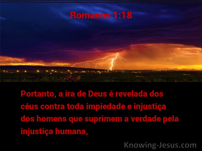 Portanto, a ira de Deus é revelada dos céus contra toda impiedade e injustiça dos homens que suprimem a verdade pela injustiça humana, pois o que de Deus se pode conhecer é evidente entre eles, porque o próprio Deus lhes manifestou. Pois desde a criação do mundo os atributos invisíveis de Deus, seu eterno poder e sua natureza divina, têm sido observados claramente, podendo ser compreendidos por intermédio de tudo o que foi criado, de maneira que tais pessoas são indesculpáveis;