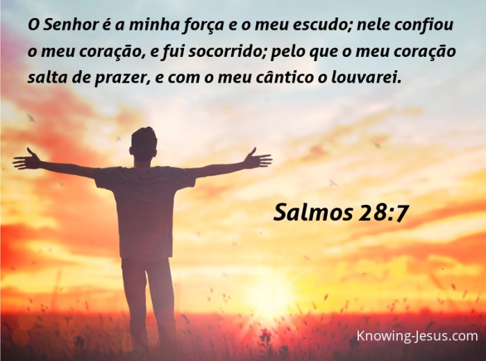 O Senhor é a minha força e o meu escudo; nele confiou o meu coração, e fui socorrido; pelo que o meu coração salta de prazer, e com o meu cântico o louvarei.