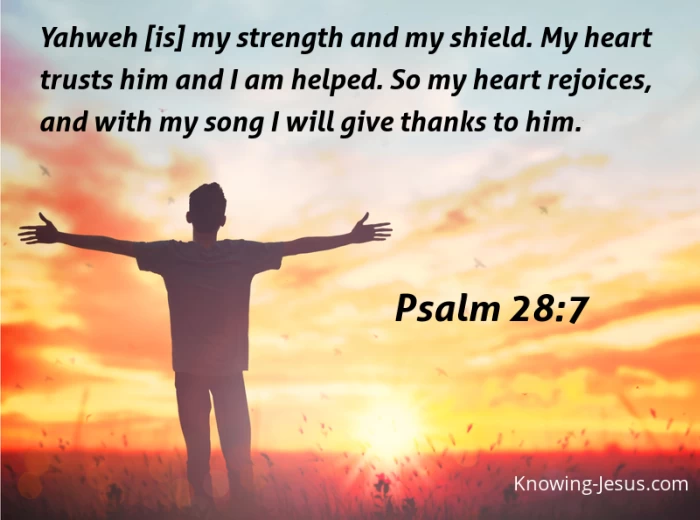 Yahweh [is] my strength and my shield. My heart trusts him and I am helped. So my heart rejoices, and with my song I will give thanks to him.