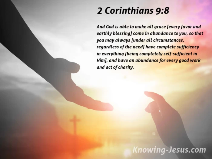 And God is able to make all grace [every favor and earthly blessing] come in abundance to you, so that you may always [under all circumstances, regardless of the need] have complete sufficiency in everything [being completely self-sufficient in Him], and have an abundance for every good work and act of charity.