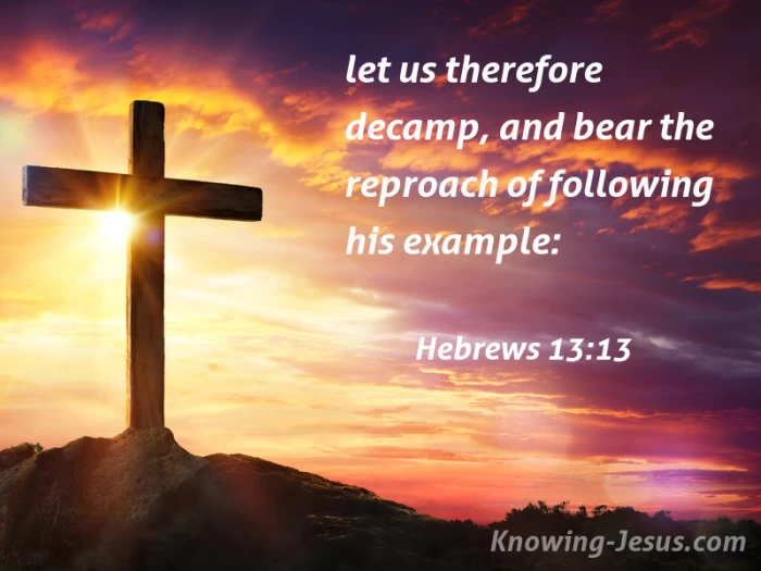 than the sacrificers had to eat of the flesh of those beasts, which were burnt without the camp, and whose blood the highpriest carried into the sanctuary. for Jesus likewise suffered without the gate, to show he was the expiatory victim for the people. let us therefore decamp, and bear the reproach of following his example: