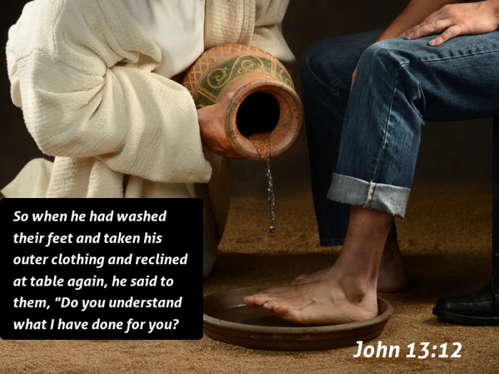 Then he poured water into the washbasin and began to wash the feet of the disciples, and to wipe [them] dry with the towel {which he had tied around himself}. Then he came to Simon Peter. He said to him, "Lord, are you going to wash my feet?" Jesus answered and said to him, "What I am doing you do not understand now, but you will understand after these [things]."read more.