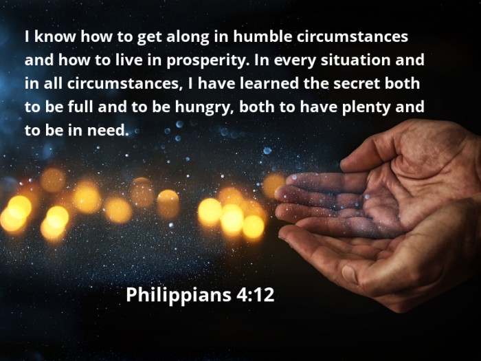 I know how to get along in humble circumstances and how to live in prosperity. In every situation and in all circumstances, I have learned the secret both to be full and to be hungry, both to have plenty and to be in need. I can do everything through Christ, who gives me the strength.