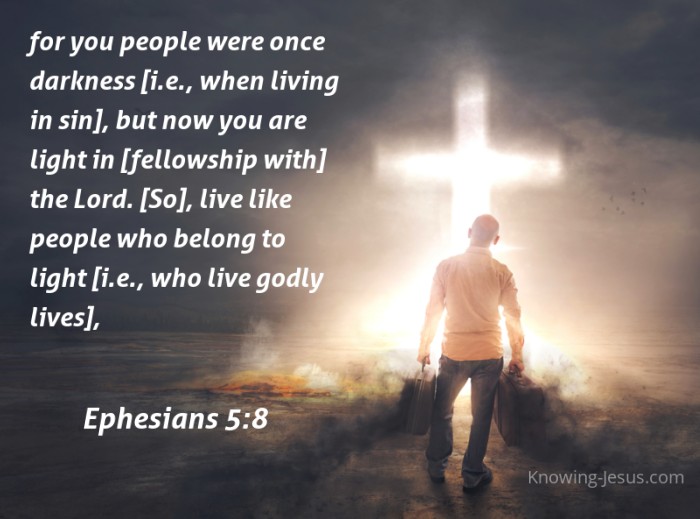 for you people were once darkness [i.e., when living in sin], but now you are light in [fellowship with] the Lord. [So], live like people who belong to light [i.e., who live godly lives], (for the product of light consists of everything good and right and true). Then you will demonstrate [or, "learn about"] a life that is very pleasing to the Lord.read more.