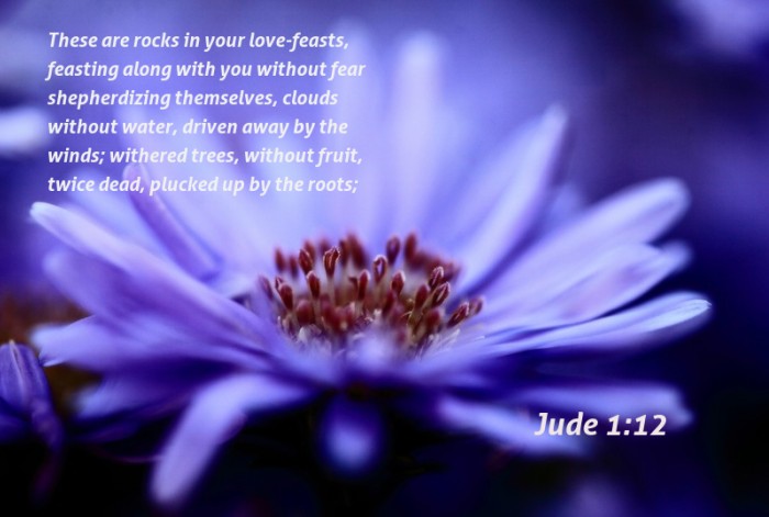 These are rocks in your love-feasts, feasting along with you without fear shepherdizing themselves, clouds without water, driven away by the winds; withered trees, without fruit, twice dead, plucked up by the roots;