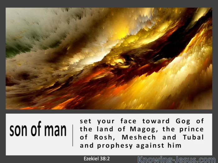 The word of Yahweh came to me, saying, Son of man, set your face toward Gog, of the land of Magog, the prince of Rosh, Meshech, and Tubal, and prophesy against him, and say, Thus says the Lord Yahweh: Behold, I am against you, Gog, prince of Rosh, Meshech, and Tubal:read more.