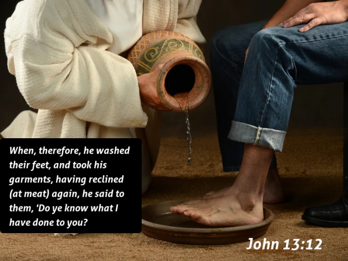 When, therefore, he washed their feet, and took his garments, having reclined (at meat) again, he said to them, 'Do ye know what I have done to you? ye call me, The Teacher and The Lord, and ye say well, for I am; if then I did wash your feet -- the Lord and the Teacher -- ye also ought to wash one another's feet.read more.